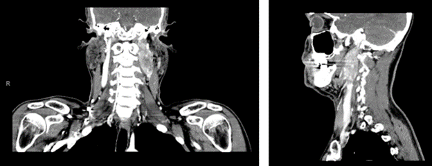 Image 1. CT scan with contrast of head and neck showing the left carotid sheath paraganglioma.